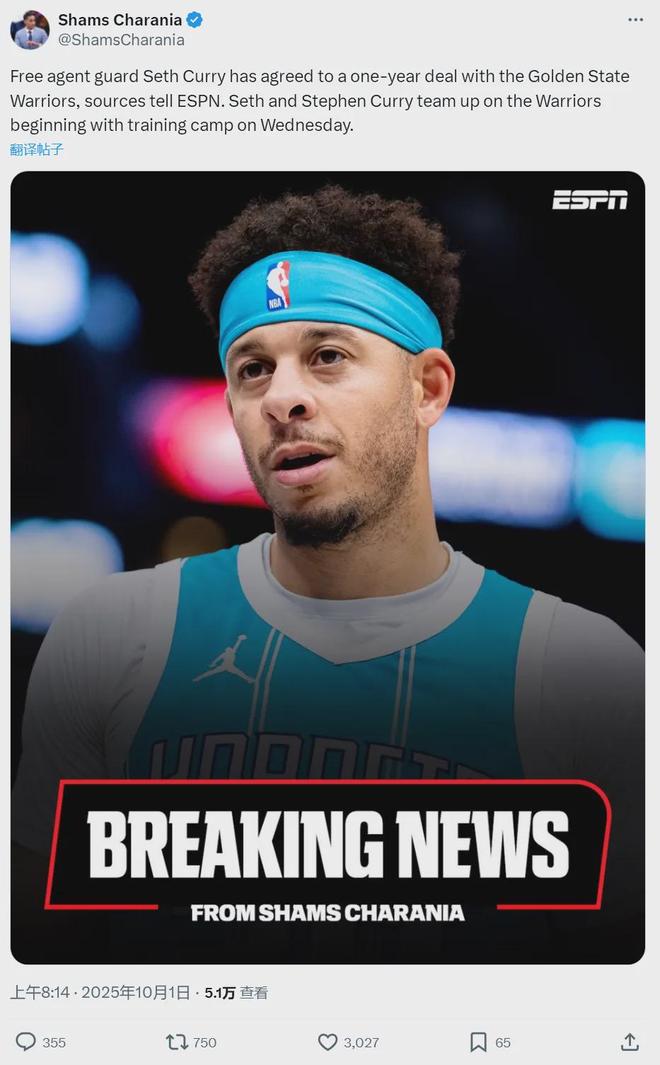 Shams:塞斯-库里已同意与勇士签订一份一年合同